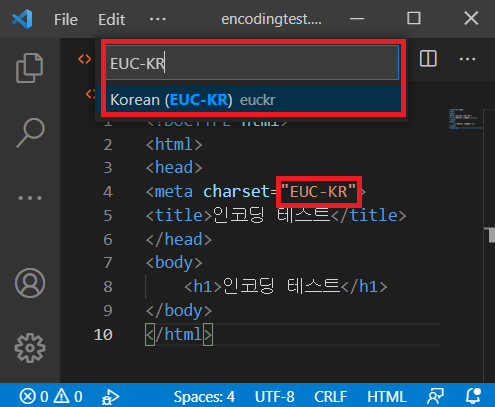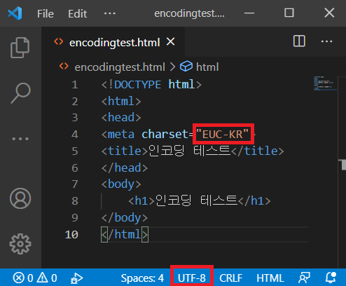 <!DOCTYPE html> <html> <head> <meta charset="EUC-KR"> <title>인코딩 테스트</title> </head> <body> <h1>인코딩 테스트</h1> </body> </html> |