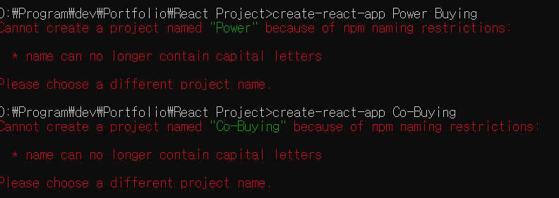 [React.JS] React 프로젝트 이름 설정 오류 (because of npm naming restrictions) 본문