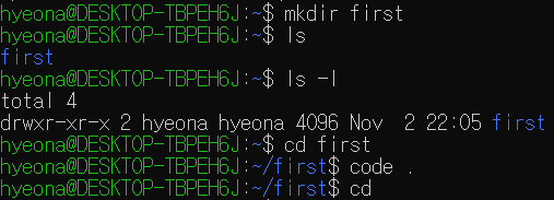 mkdir 디렉터리명: 파일 생성 (make directory)