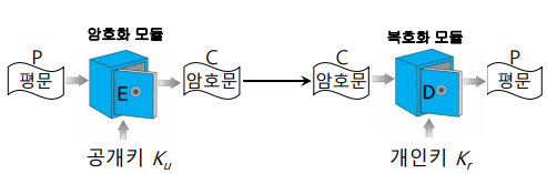 공개키 암호 알고리즘 : 키를 공개하는 암호화와 복호화에 서로 다른 키를 사용하는 암호