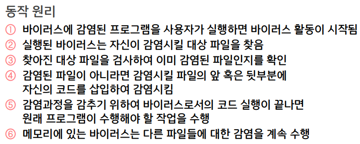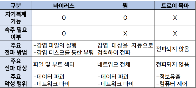 - ex) 바이러스, 웜, 트로이 목마, 백도어, 스파이웨어, 랜섬웨어 등