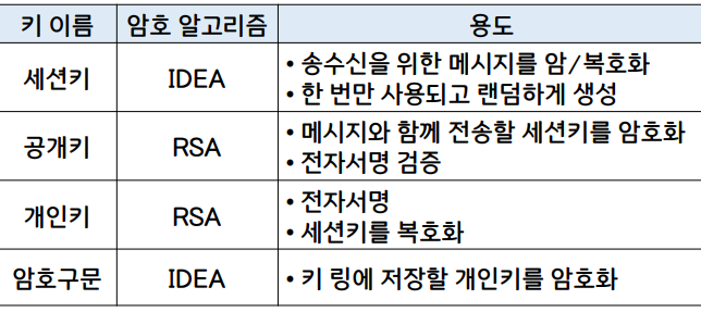 기밀성 : IDEA 이용, RSA를 사용하여 키를 분배하며 일회용 비밀키를 세션키로 사용